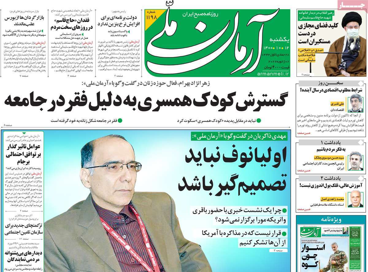روزنامه آرمان ملی نیز برای گفت و گوی خود با مهدی ذاکریان کارشناس مسائل بین الملل این تیتر را برگزید که اولیانوف نباید تصمیم گیر باشد.