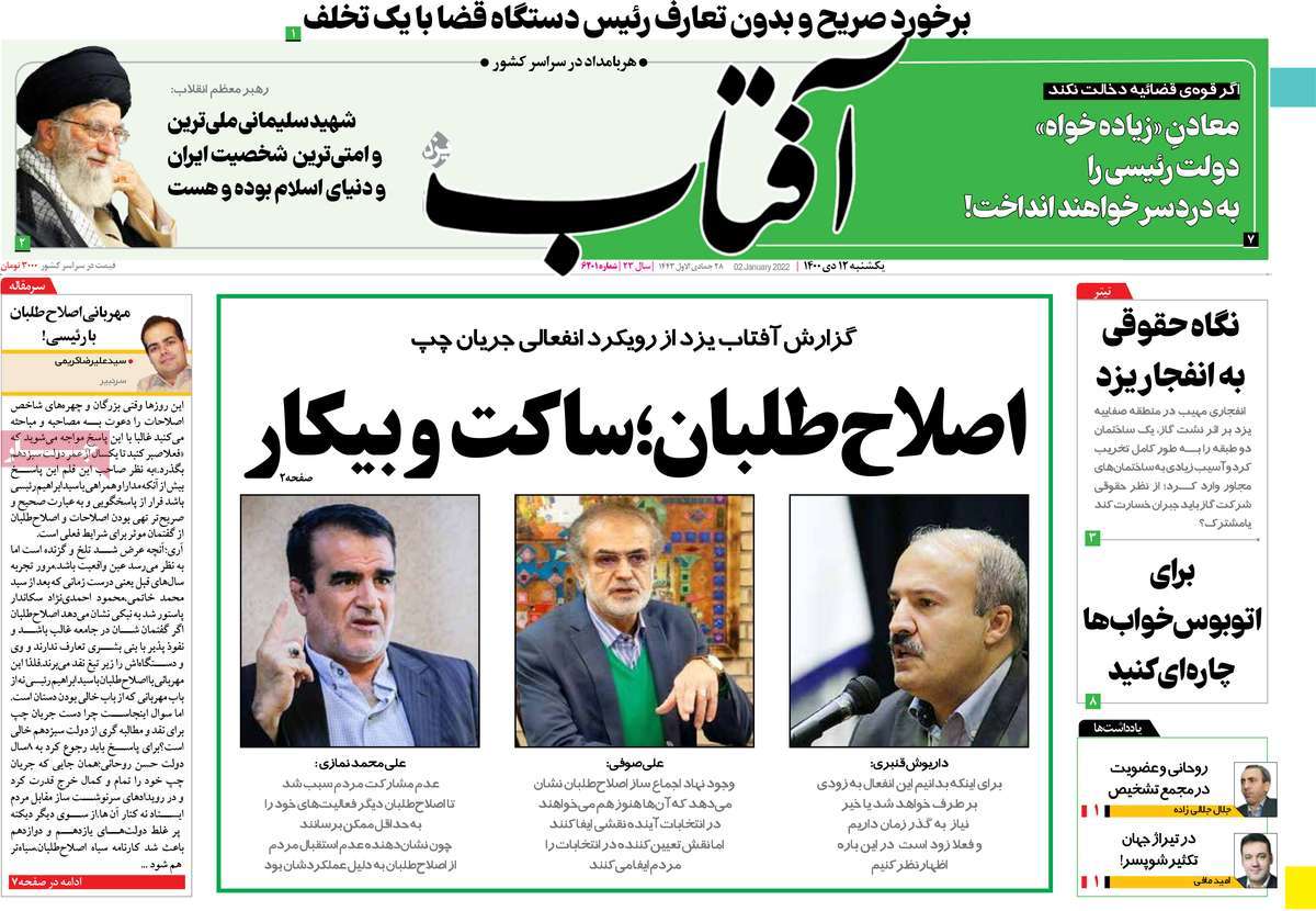 روزنامه آفتاب یزد در گزارشی با عنوان اصلاح طلبان ساکت و بیکار نوشته است که پس از روی کار آمدن دولت سیزدهم هیچ صدای رسایی از اصلاح طلبان شنیده نمی شود.