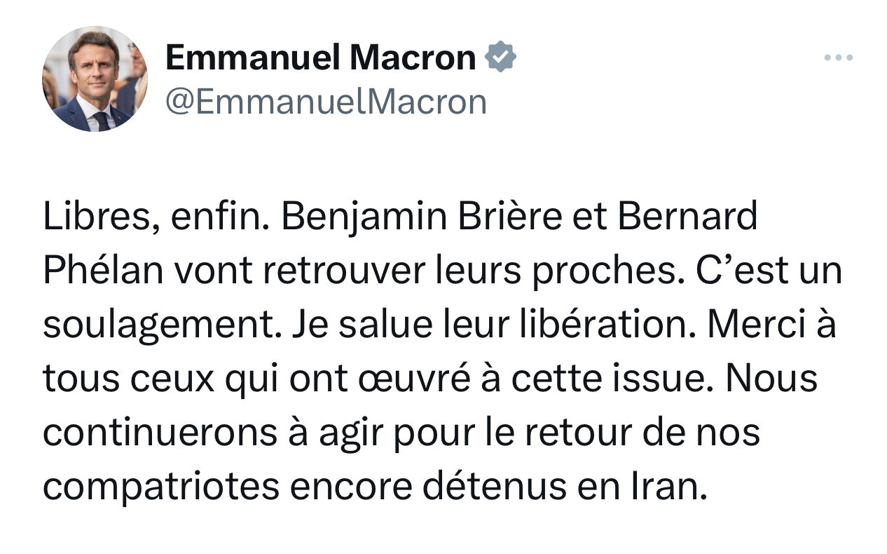 رئیس جمهور فرانسه در توییتى نوشت: «بنجامین بریر» و «برنارد فیلان» آزاد شدند.