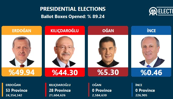 پس از شمارش۸۹٫۲۴ درصد آرای انتخابات ریاست جمهوری ترکیه، شمار آرای رجب طیب اردوغان به ۴۹٫۹۴ درصد کاهش یافت. قلیچدار اوغلو، رقیب اردوغان نیز توانسته ۴۴٫۳ درصد آرا را بدست بیاورد.