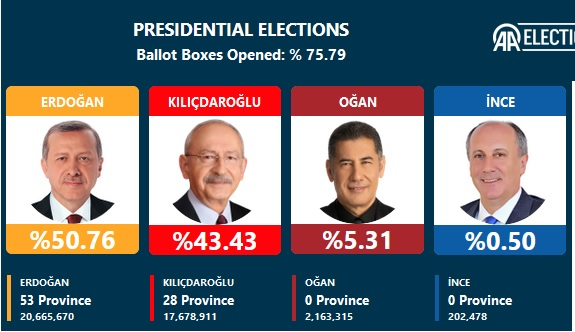در حالی که ۷۵٫۷۹ درصد از آرای انتخابات ریاست جمهوری ترکیه شمارش شده است اردوغان ۵۰٫۷۶ درصد و قلیچدار اوغلو ۴۳٫۵۲ درصد آرا را توانستهاند بدست بیاورند.