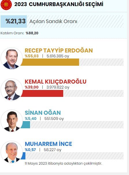 ۲۰:۱۵- نتایج شمارش ۳۲ درصد از صندوق آرای انتخابات ترکیه نشان می دهد که اردوغان همچنان پیشتاز بوده و توانسته است که ۵۳.۳۷ درصد از آرای مردم را کسب کند و آرای کمال قلیچداراوغلو رقیب وی به ۴۰.۶۸ درصد افزایش یافته و آرای سینان اوغان دیگر رقیب این انتخابات نیز ۵.۳۹ درصد است.