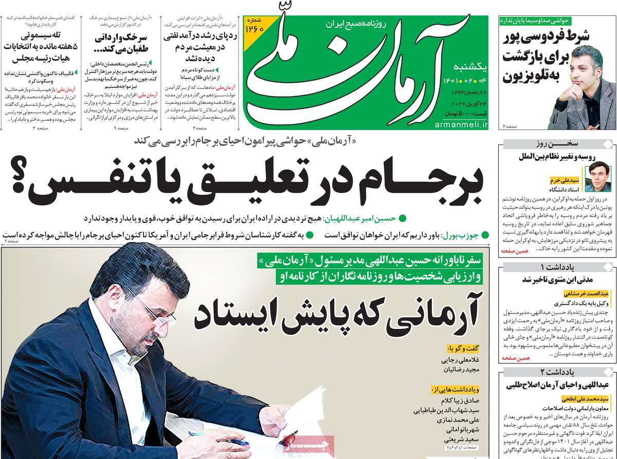 نخستین شماره آرمان ملی پس از درگذشت عبداللهی در روز چهارم اردیبهشت به یادداشت‌ها و مصاحبه‌هایی درباره او و وقفه در انتشار اختصاص دارد و در کنار آن گزارش هایی درباره احیای برجام و مجلس و صداوسیما منتشر شده است.