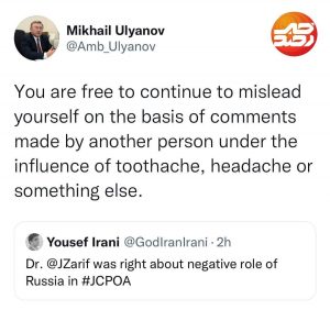نماینده روسیه در مذاکرات وین پیش از این، توییت دیگری باذکر نام ظریف منتشر کرده بود که آن را حذف کرد. او نوشته بود: «شما مختارید که بر اساس نظرات آقای ظریف، خود را گمراه کنید.»