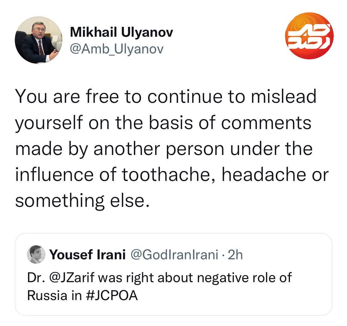 رصد خبر | میخاییل اولیانوف نماینده روسیه در مذاکرات وین در یک توییت تند به محمد جواد ظریف وزیر خارجه سابق ایران اهانت کرد.