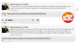 اولیانوف در پاسخ به توییتی خطاب به او که نوشته شده «دکتر ظریف درمورد نقش منفی روسیه در مذاکرات برجام درست گفته بود»، نوشت: شما مختارید که بر اساس نظرات شخص دیگری که تحت تأثیر دندان درد، سردرد یا چیزهای دیگر بوده؛ خود را گمراه کنید.»