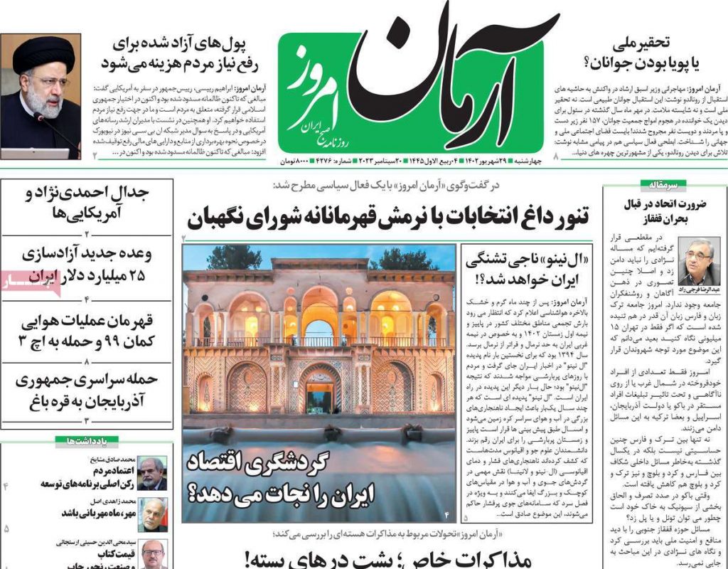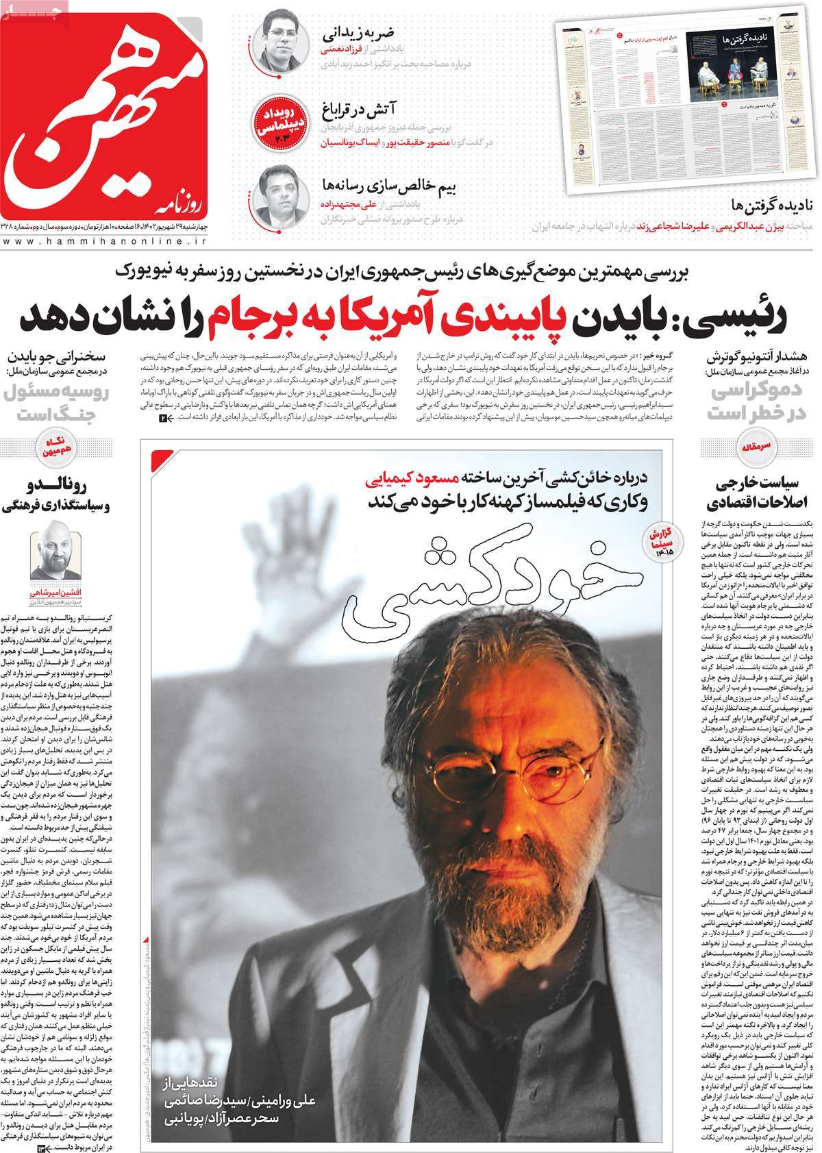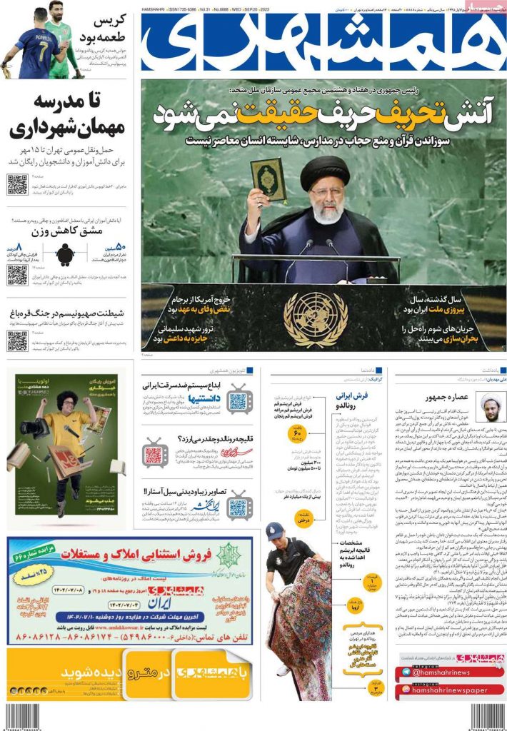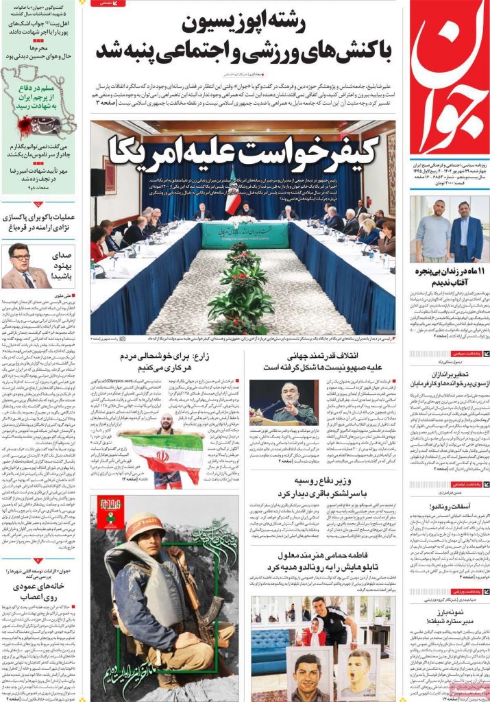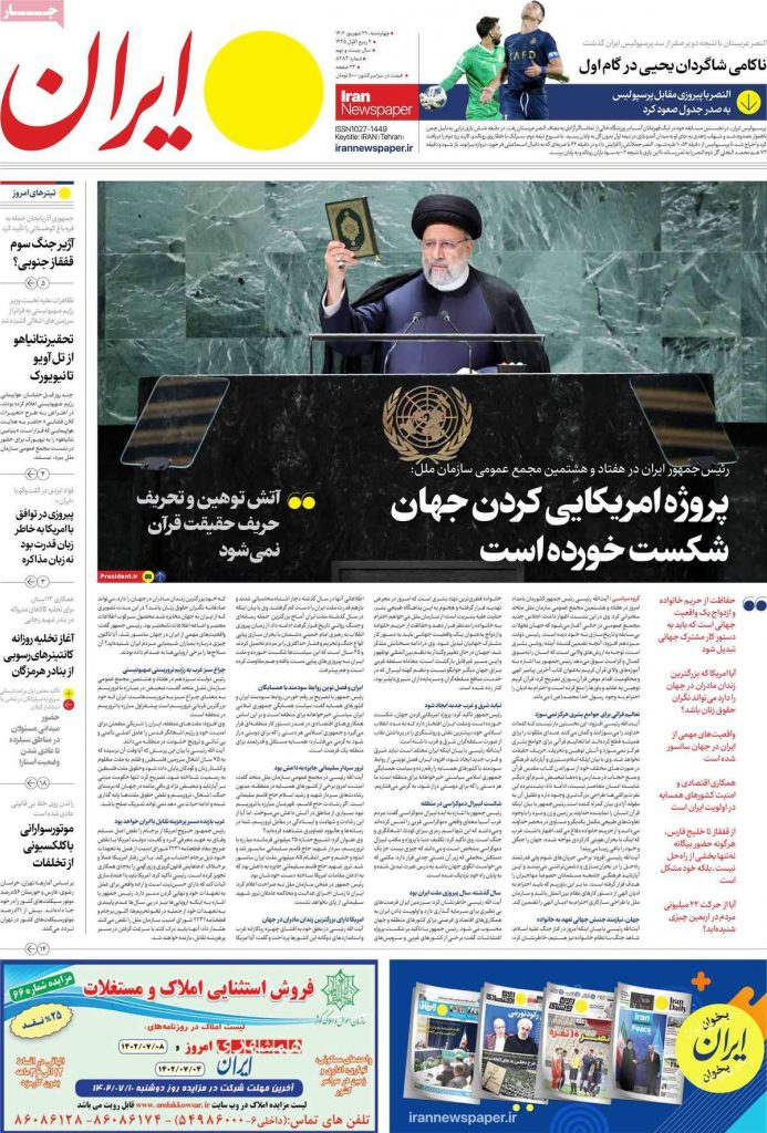 رصد خبر | روزنامههای حامی دولت در شماره امروز ۲۹ شهریور همچون روزهای گذشته، سفر رییسی به نیویورک و سخنرانیهای او را برجسته کردند و با کلید واژههای “محاکمه آمریکا” و “کبفر خواست علیه آمریکا” آن را در صفحات نخست منتشر کردند.