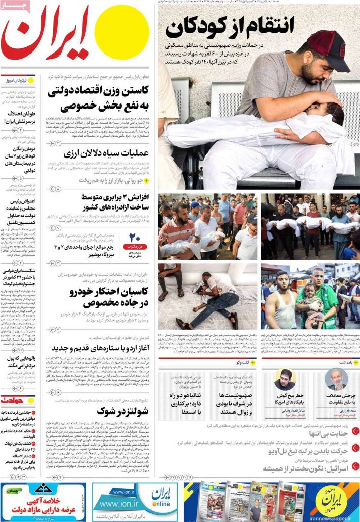 رصد خبر | طوفان الاقصی همچنان بر تمامی موضوعات خبری در مطبوعات روز سه‌شنبه ۱۸ مهر در ایران غلبه دارد. طرح‌های بدیع گرافیکی و تیترهای نخست اغلب روزنامه‌ها در هر دو سوی فکری به درگیری غزه اختصاص یافته است.