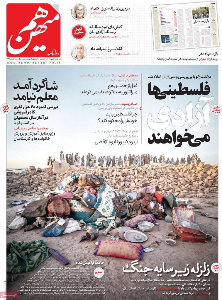 درکنار موضوع فلسطین، هم میهن مردم هرات را جامعه‌ای فراموش شده توصیف کرده است. شرق از تفاوت زندگی معاودین عراقی و مهاجران افغانستانی در ایران گزارش داده است. جمهوری اسلامی هم از ناتوانی طالبان در جذب کمک‌های مردمی به زلزله‌زدگان نوشته است. اطلاعات هم پیشنهاد کرده منطقه آزاد سیاسی برای رفت و آمد ایرانیان خارج تشکیل شود.
