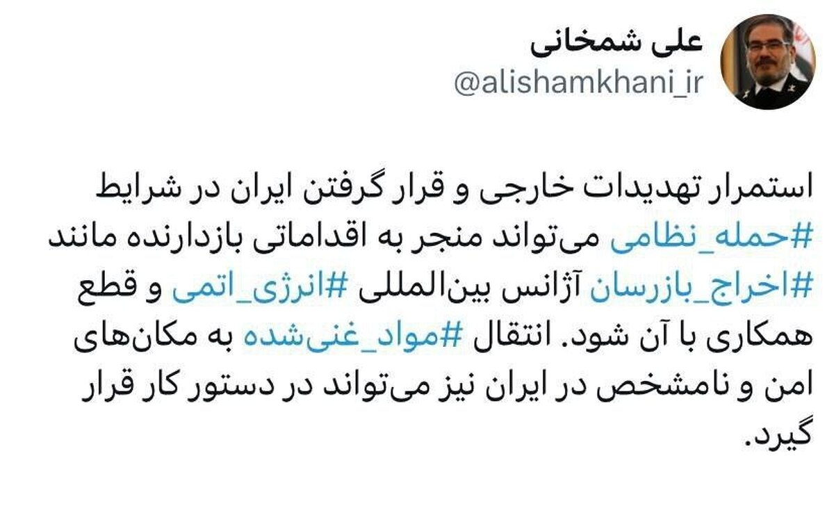 علی شمخانی، مشاور سیاسی رهبر معظم انقلاب، روز پنجشنبه ۲۱ فروردین در واکنش به تهدیدات نظامی آمریکا هشدار داد که در صورت حمله نظامی، ایران میتواند بازرسان آژانس بینالمللی انرژی اتمی را اخراج کرده و همکاری با این نهاد را قطع کند. وی افزود: «انتقال مواد غنیشده به مکانهای امن و نامشخص نیز میتواند در دستور کار قرار گیرد.» این اظهارات بازتاب گستردهای در رسانههای جهانی داشت و بهعنوان نشانهای از تشدید تنش تلقی شد.