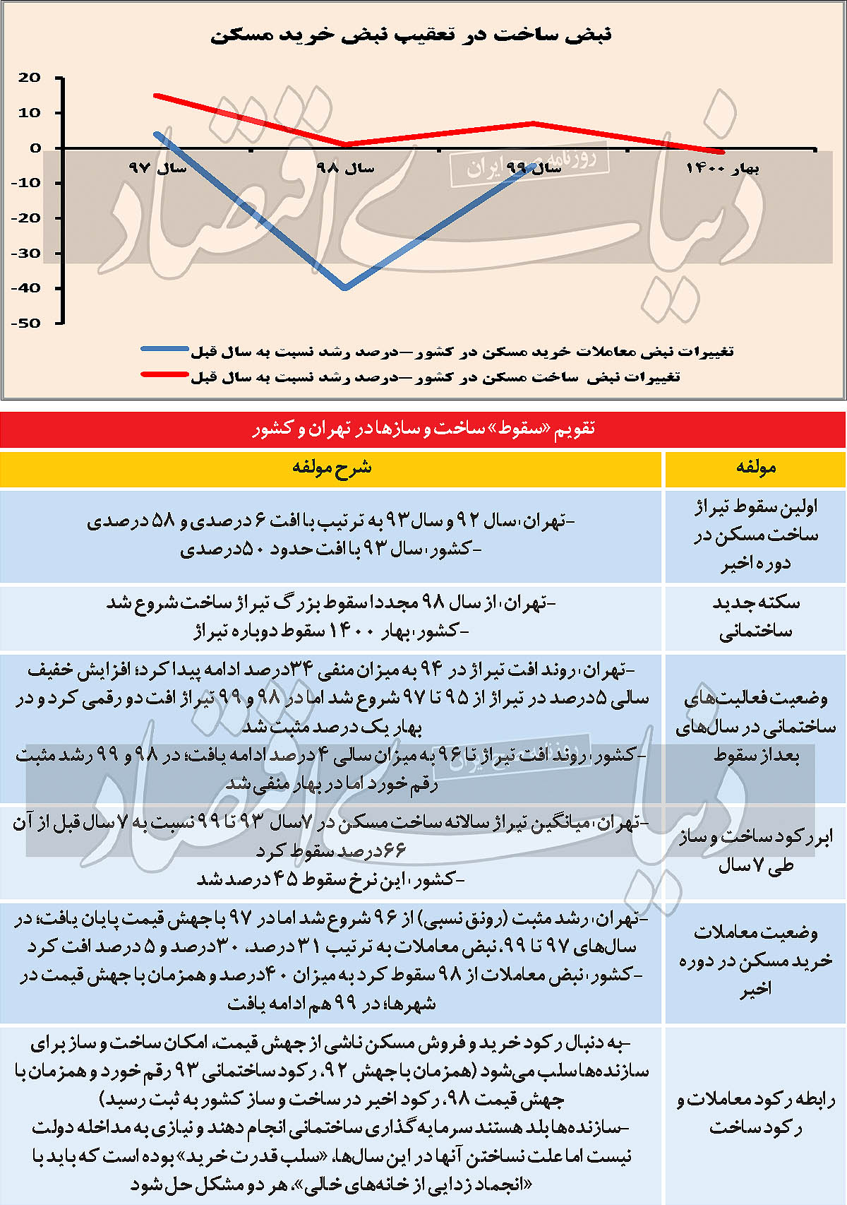 به این ترتیب در شرایطی که طی سه سال با وجود رکودی بودن بازار ساخت و ساز، رشد خفیف در آمار مسکن‌‌سازی کشور ثبت شده بود، افت یکباره تیراژ ساخت در بهار ۱۴۰۰ به مثابه یک سکته در آمار منعکس شده است. پیش از این آخرین رشد منفی تیراژ ساخت در کشور مربوط به سال ۹۶ بوده است.