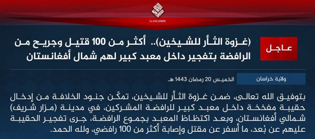 گروه تروریستی داعش ساعتی پس از وقوع انفجار، مسئولیت حمله به مسجد شیعیان مزار شریف را برعهده گرفت.