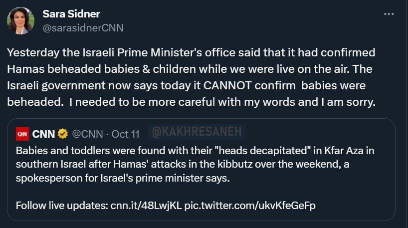 سارا سیدنر خبرنگار و مجری سی ان ان پس از برملا شدن این دروغ بزرگ و ساختگی در حساب کاربری خود در شبکه اکس ( توییتر سابق) نوشت: روز گذشته دفتر نخست وزیر اسرائیل در برنامه زنده سی ان ان سر بریدن نوزادان و کودکان توسط حماس را تایید کرد. امروز دولت اسرائیل می گوید نمی تواند سر بریدن نوزادان را تایید کند. باید بیشتر مراقب اظهاراتم می بودم و عذرخواهی می کنم.