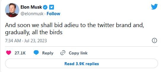 ایلان ماسک، مالک میلیاردر توییتر در توییتی نوشت: به زودی باید با برند توییتر و به تدریج، با همه پرنده‌ها خداحافظی کنیم.