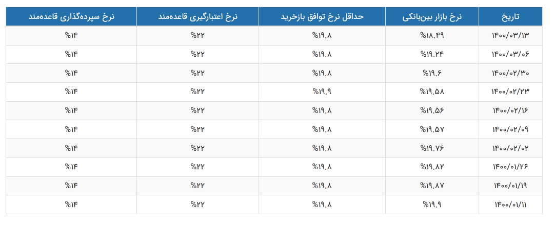 براساس اعلام بانک مرکزی نرخ سود بازار بین بانکی در سال ۱۴۰۰ روند نزولی داشته و از کانال ۱۹ درصد گذشته و به ۱۸.۴۹ درصد رسید.