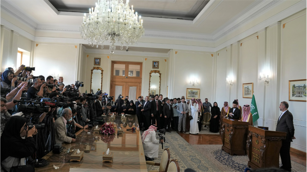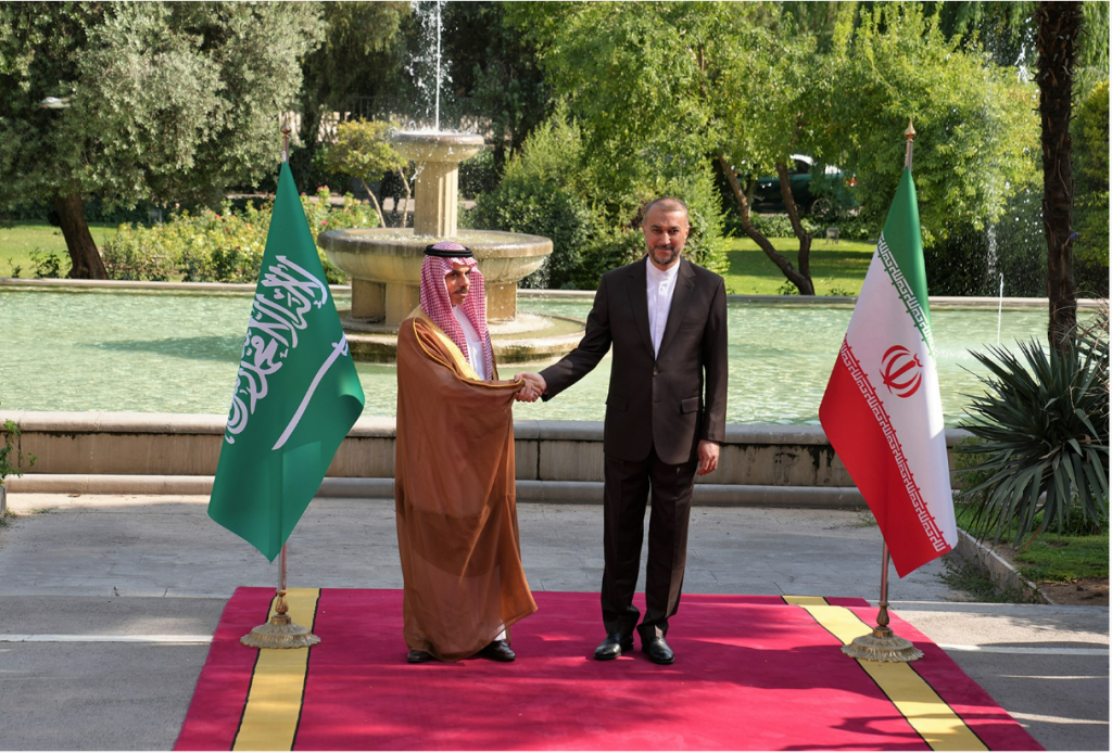 فیصل بن فرحان، نخستین وزیر خارجه عربستان سعودی که در ۱۷ سال اخیر به ایران میآید پس از استقبال محمدرضا عنایتی مدیرکل خلیج فارس در بدو ورود و حسین امیرعبداللهیان در حیاط وزارت امور خارجه مذاکرات خود در تهران را شروع کرد.