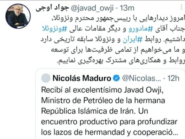 وزیر نفت ایر ان هم پس از آن در توییتر نوشت: امروز دیدارهایی با رییس جمهور ونزوئلا جناب آقای مادورو و دیگر مقامات عالی ونزوئلا داشتیم.