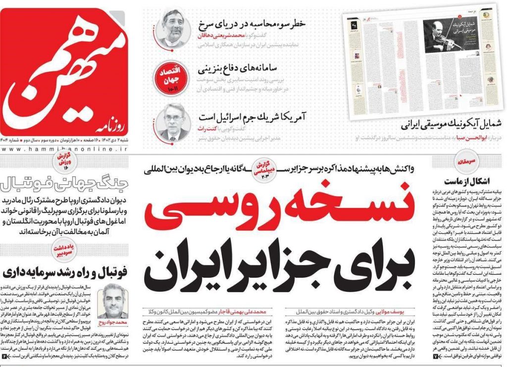 تیتر یک روزنامه هم‌میهن در شماره روز شنبه« نسخه روسی برای جزایر ایرانی» است. در سرمقاله این روزنامه با عنوان « اشکال از ماست» نوشته شده است: برخی تحلیل‌گران معتقدند که روسیه نمی‌تواند شریک راهبردی ایران باشد. شاید در جهان دوقطبی پیش از ۱۹۹۰ چنین شراکتی قابل تصور بود، ولی اکنون وارد شدن شراکت راهبردی به سختی قابل تصور است. اصولاً با سیاست‌های موجود تهران هیچ کشوری نمی‌تواند شریک راهبردی تلقی شود. بنابراین ضمن آنکه با روس‌ها باید بهترین روابط را داشت، ولی در تعامل دوجانبه نباید تصور و انتظارات راهبردی از آنان داشت و در نتیجه دلیلی ندارد که در سطح مزبور وارد رابطه شد. ایران نیز متقابلاً و به دلایل گوناگون نمی‌تواند شریک راهبردی برای روسیه باشد. روس‌ها نیازمند دور زدن غرب و مقابله با آن از طریق چین، هند، برزیل و سایر قدرت‌های منطقه‌ای مثل اعراب هستند و برای این کار از هر برگی که می‌توانند استفاده می‌کنند. روس‌ها حتی برای تحقق این هدف خود در مواضع منطقه‌ای به‌ویژه نسبت به اسرائیل نیز تغییرات جدی داده‌اند. طبیعی است که با ایران نیز همین برخورد را خواهند کرد. البته اسرائیل به دلیل روابطش با غرب و حتی وجود سنت یهودی قدرتمند در روسیه و روس‌ها، چندان نگران این تغییر موضع آنان نیست.