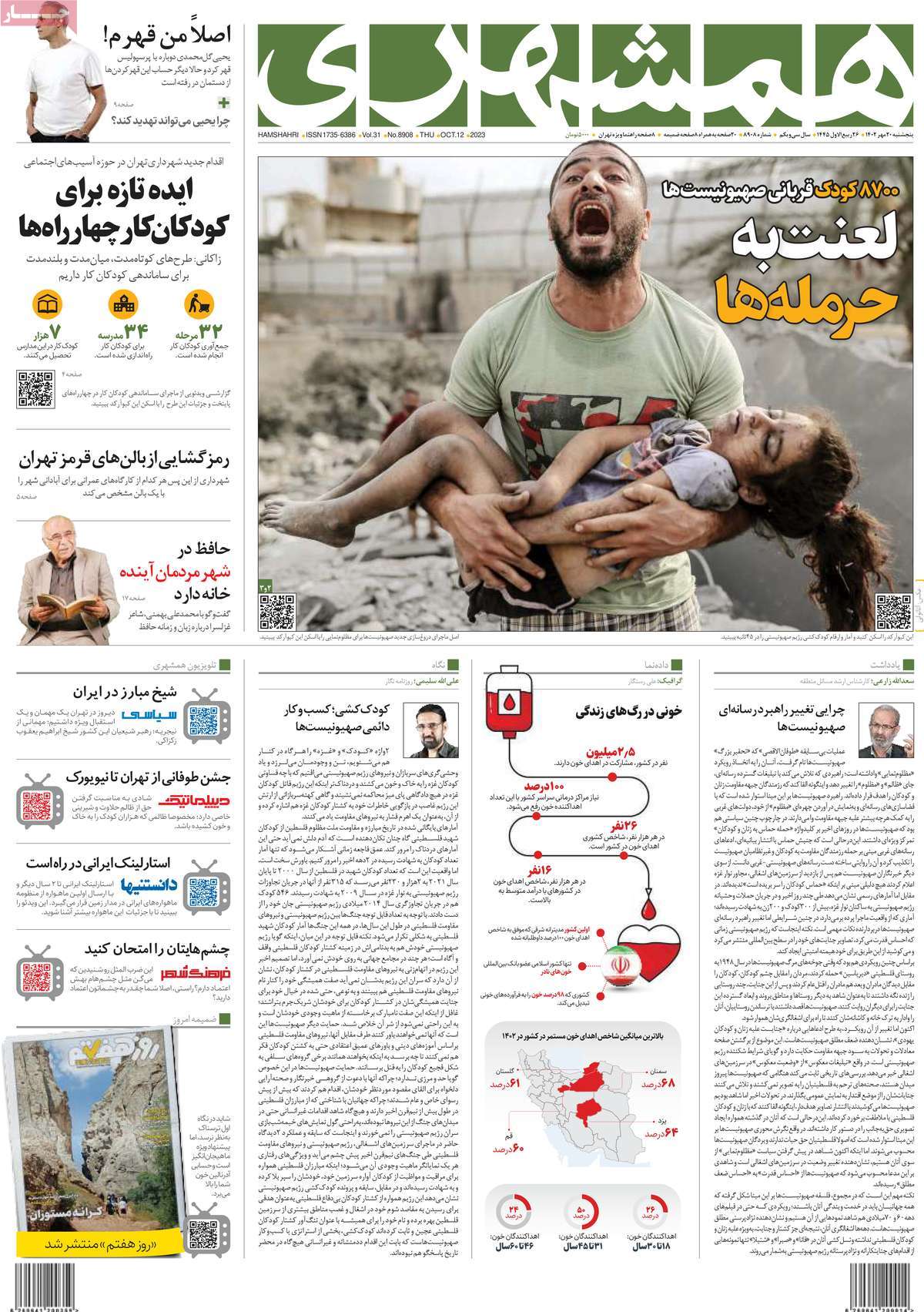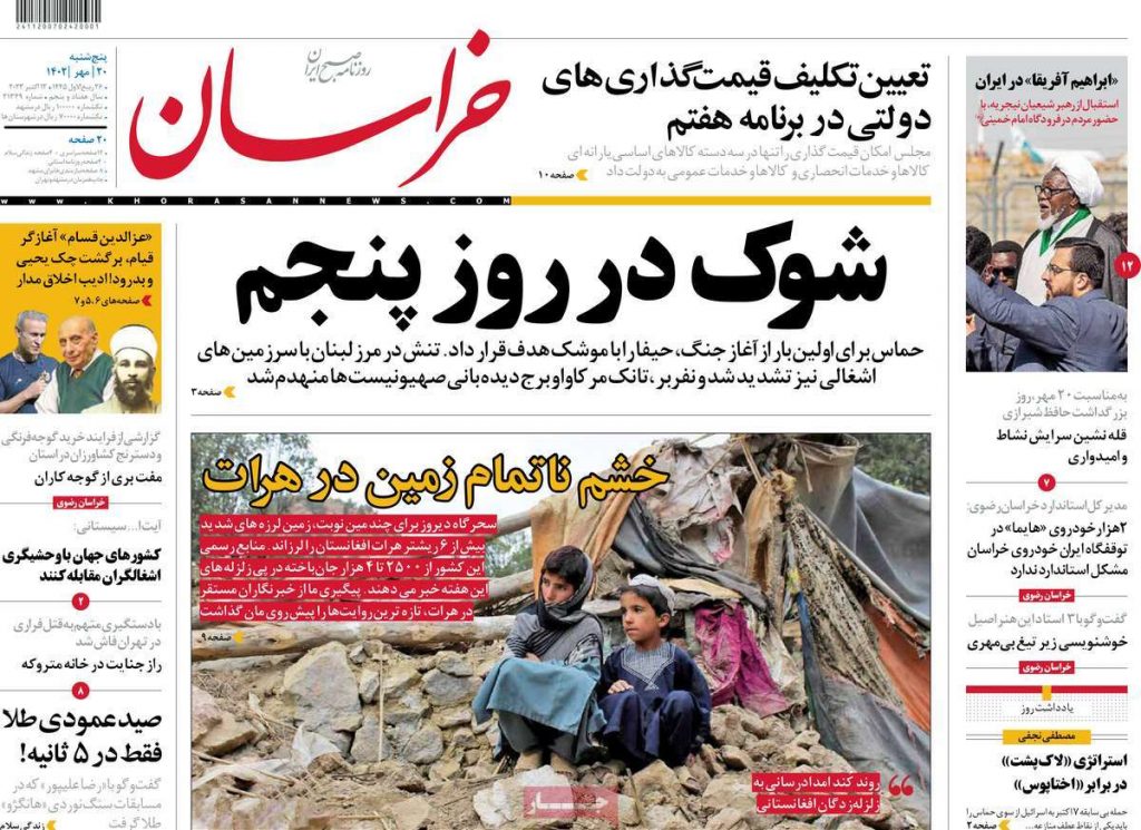 رصد خبر | پنج روز پس از نبرد حماس و طوفان الاقصی، این موضوع همچنان تیتر و عکس نخست اغلب روزنامههای ایران در شماره پنجشنبه ۲۰ مهر است. در کنار آن برخی مطبوعات به دومین زلزله مرگبار افغانستان توجه کردهاند و بعضی دیگر درباره پیامدهای مثبت یا منفی حضور مهاجران افغانستانی در ایران نوشتهاند.