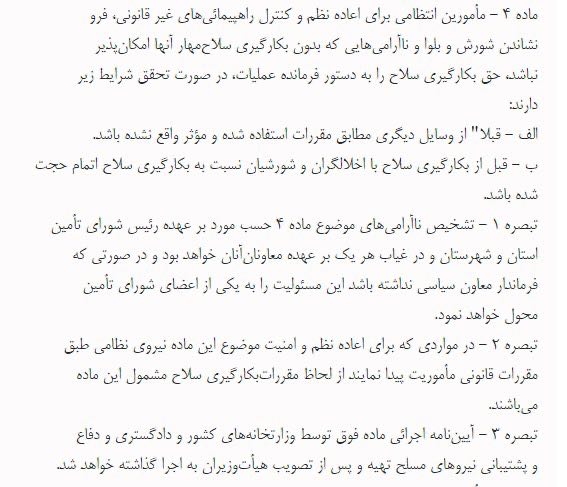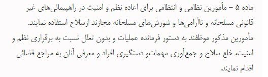 شرایط استفاده از سلاح در ماده ٣ این قانون طی ١٠ بند و همینطور مواد ۴ و ۵ آن توضیح داده شده. تجمع زنانی که از قبل برای ورود به ورزشگاه بلیط خریده بودند شامل کدامیک از این شرایط میشود که به صورت آنها اسپری فلفل پاشیده شده؟ آیا ناجا توضیح مستندی برای انجام این اقدام دارد؟